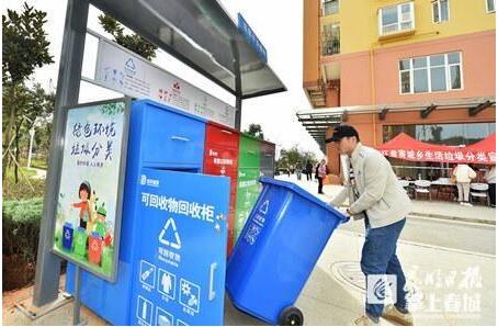 日前,昆明市福澤雅苑小區(qū)作為盤龍區(qū)第二個試點小區(qū),啟動垃圾分類,居民只要將垃圾分類正確并達到一定數(shù)量,就可以獲得積分,然后用積分兌換生活用品。圖為京環(huán)盤宸公司工作人員查看垃圾分類投放點。記者王俊星攝記者在福澤雅苑小區(qū)入口處看到,云南京環(huán)盤宸環(huán)境資源有限公司(以下簡稱京環(huán)盤宸公司)在小區(qū)內(nèi)投放的垃圾回...