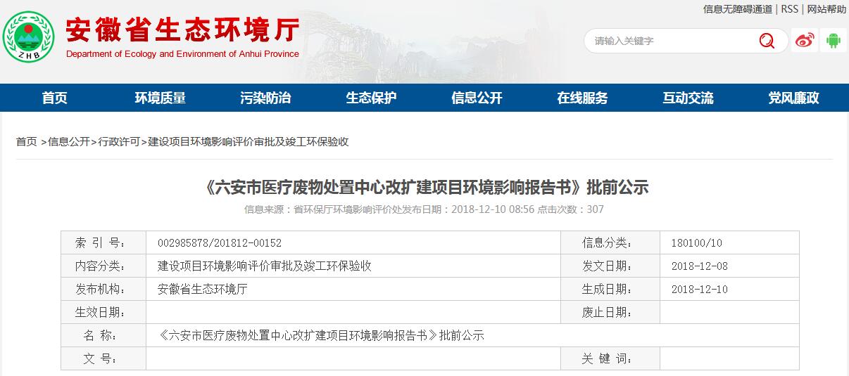 日前,安徽省生態(tài)環(huán)境廳對《六安市醫(yī)療廢物處置中心改擴建項目環(huán)境影響報告書》進行批前公示,詳情如下:根據(jù)建設(shè)項目環(huán)境影響評價審批程序的有關(guān)規(guī)定,經(jīng)審議,我廳擬對《六安市醫(yī)療廢物處置中心改擴建項目環(huán)境影響報告書》作出審批意見。為保證審批意見的嚴肅性和公正性,現(xiàn)將該項目環(huán)境影響評價文件的基本情況予以公示。...