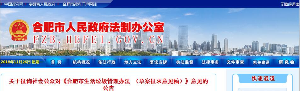 日前,合肥市發(fā)布了關(guān)于征詢社會(huì)公眾對《合肥市生活垃圾管理辦法 (草案征求意見稿)》意見的公告,詳情如下:為了提高立法透明度,充分聽取公眾的意見和建議,擴(kuò)大政府立法的公眾參與,現(xiàn)將《合肥市生活垃圾管理辦法(草案征求意見稿)》全文向社會(huì)公布,公開征求公眾意見,期望廣大網(wǎng)友和有關(guān)單位積極發(fā)表修改意見和建議...