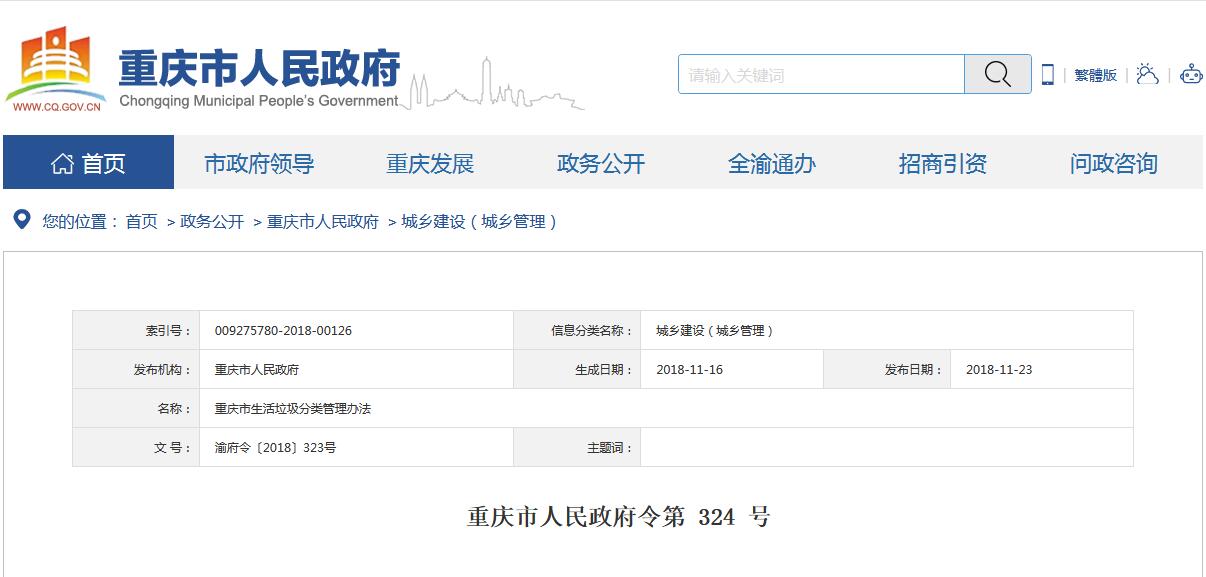 日前,重慶市政府發(fā)布了《重慶市生活垃圾分類管理辦法》,詳情如下:重慶市人民政府令第 324 號《重慶市生活垃圾分類管理辦法》已經(jīng)2018年11月1日市第五屆人民政府第30次常務(wù)會(huì)議通過,現(xiàn)予公布,自2019年1月1日起施行。市 長 唐良智2018年11月16日(此件公開發(fā)布)重慶市生活垃圾分類管理辦...