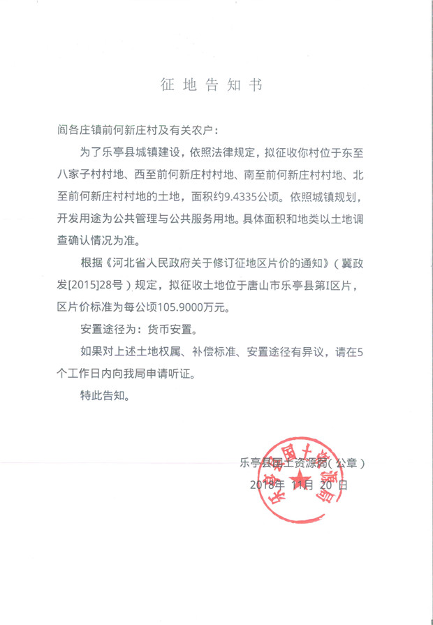 日前唐山樂亭縣政府發(fā)布了《樂亭縣固廢綜合處理廠生活垃圾焚燒發(fā)電項目建設用地征地告知書》,該告知書顯示擬征收樂亭縣閻各莊鎮(zhèn)前何新莊村位于東至八家子村村地、西至前何新莊村村地、南至前何新莊村村地、北至前何新莊村村地的土地,面積約9.4335公頃。具體內容如下: