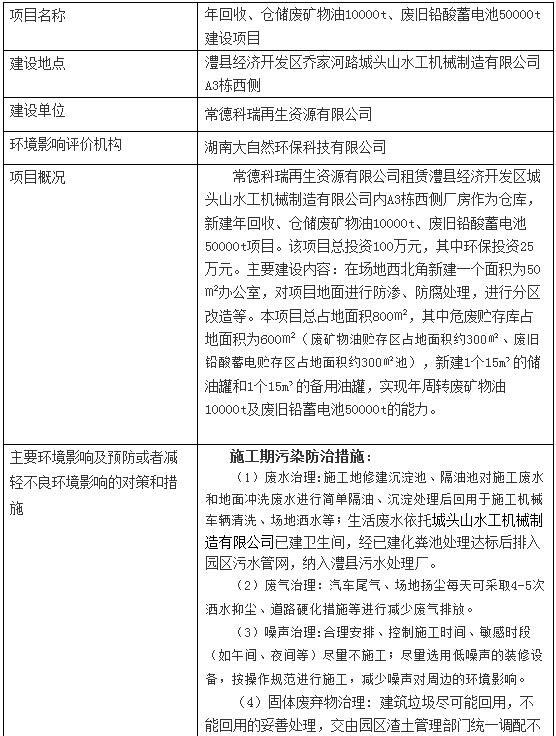 日前,湖南澧縣對年回收、倉儲廢礦物油10000t、廢舊鉛酸蓄電池50000t建設項目環(huán)境影響報告表進行擬審批公示,詳情如下:年回收、倉儲廢礦物油10000t、廢舊鉛酸蓄電池50000t建設項目環(huán)境影響報告表擬審批公示經(jīng)審議,我局擬于近日內批準《年回收、倉儲廢礦物油10000t、廢舊鉛酸蓄電池5000...