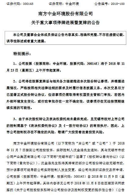 中金環(huán)境11月22日晚間公告,公司實際控制人沈金浩擬將1.28億股股份(占公司總股本的6.65%)轉讓給無錫市政,轉讓價格為4.42元/股,交易作價5.65億元。此外,沈金浩擬通過表決權委托方式將剩余股份中2.33億股股份對應的表決權委托給無錫市政,占公司總股本的12.13%。交易完成后公司控股股東...