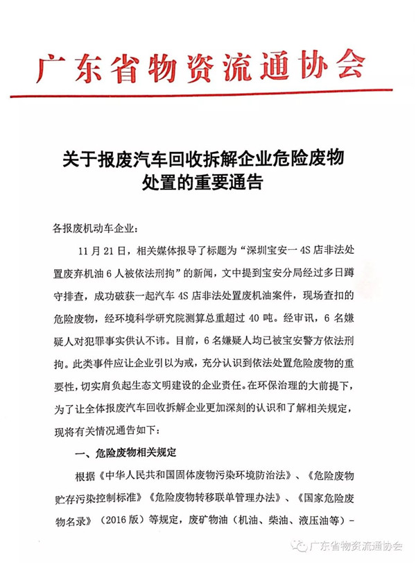 近日,廣東省物質流通協(xié)會發(fā)布了《關于報廢汽車回收拆解企業(yè)危險廢物處置的重要通告》。具體內容如下:原標題:關于報廢汽車回收拆解企業(yè)危險廢物處置的重要通告