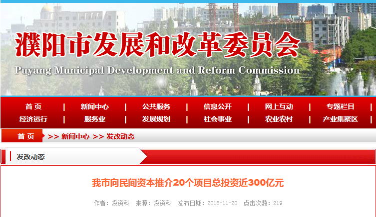 11月16日,河南省召開2018年向民間資本推介項目會議。會上,我市向民間資本推介了重點領域20個項目,總投資299.04億元,分別占全省的9.17%、11.4%。從項目具體情況看,這批推介項目涵蓋了交通、水利、城市建設、生態(tài)環(huán)保、社會民生等五個方面。關交通領域項目1個,總投資43160萬元,主要建...