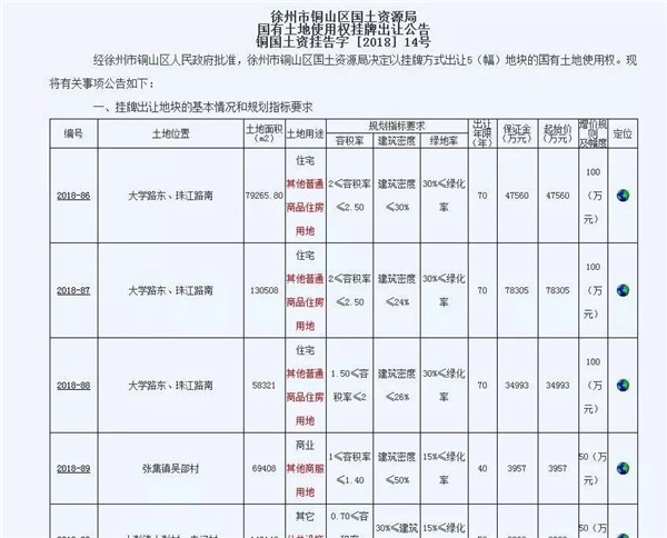 2018年11月15日,徐州市銅山區(qū)國土資源局發(fā)布國有土地使用權(quán)掛牌出讓公告銅國土資掛告字[2018]14號(hào),掛牌出售5塊地塊。其中包括2018-90號(hào)地塊。巧合的是,該幅地塊同徐州市銅山區(qū)國土資源局于10月18日發(fā)布的國有土地使用權(quán)掛牌出讓公告銅國土資掛告字[2018]12號(hào)中的2018-77地塊...