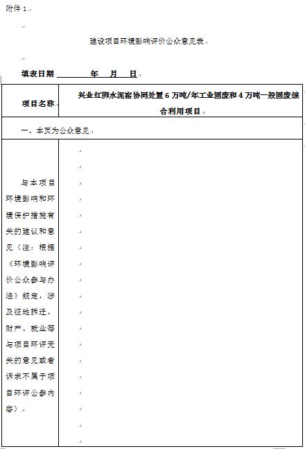 興業(yè)紅獅水泥窯協(xié)同處置6萬噸/年工業(yè)固廢和4萬噸一般固廢綜合利用項(xiàng)目環(huán)境影響評(píng)價(jià)公眾參與第一次信息公示一、項(xiàng)目概況 (1)項(xiàng)目名稱:興業(yè)紅獅水泥窯協(xié)同處置6萬噸/年工業(yè)固廢和4萬噸一般固廢綜合利用項(xiàng)目(2)建設(shè)性質(zhì):新建(3)建設(shè)地址:廣西玉林市興業(yè)縣葵陽鎮(zhèn)、葵陽建材產(chǎn)業(yè)園廣西恒慶建材有限公司現(xiàn)有廠...