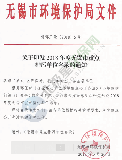 無錫市環(huán)境保護局發(fā)布了《關(guān)于印發(fā)2018年無錫市重點排污單位名錄的通知》,涉及大氣污染物排放、污水處理及工業(yè)固廢處置等排污企業(yè)共180家,具體內(nèi)容如下: