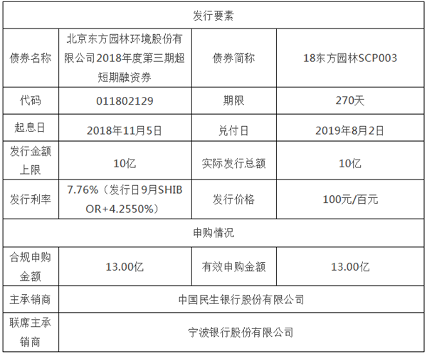 11月5日東方園林發(fā)布了《東方園林超短期融資券發(fā)行情況公告》,具體內(nèi)容如下:北京東方園林環(huán)境股份有限公司超短期融資券發(fā)行情況公告證券代碼:002310股票簡稱:東方園林公告編號:2018-163本公司及董事會全體成員保證信息披露的內(nèi)容真實(shí)、準(zhǔn)確、完整,沒有虛假記載、誤導(dǎo)性陳述或重大遺漏。北京東方園林...
