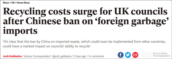 中國自今年1月起為配合新推出的環(huán)境政策,拒收大部分的外國紙類和,英國地方政府對此叫苦連天。根據(jù)調查發(fā)現(xiàn),因中國等國家決定不再回收來自外國的垃圾,造成2成英國地方政府只能自行救濟處理垃圾而造成預算吃緊。當?shù)卣粲鯓I(yè)者,應共同負擔激增的回收成本,并減少使用不易回收的包裝材料。據(jù)《英國獨立報》10月20...