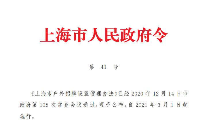 文章導(dǎo)讀戶外招牌是城市公共空間的重要組成部分,直接關(guān)系到城市安全和城市形象。安全規(guī)范、賞心美觀的戶外招牌,展現(xiàn)的是上海的文化內(nèi)涵,傳播的是上海的城市文明?!渡虾J袘敉庹信圃O(shè)置管理辦法》(市政府41號令發(fā)布,以下簡稱《辦法》)將于2021年3月1日起施行。希望通過《辦法》,將主體責(zé)任、監(jiān)管責(zé)任與自治共...