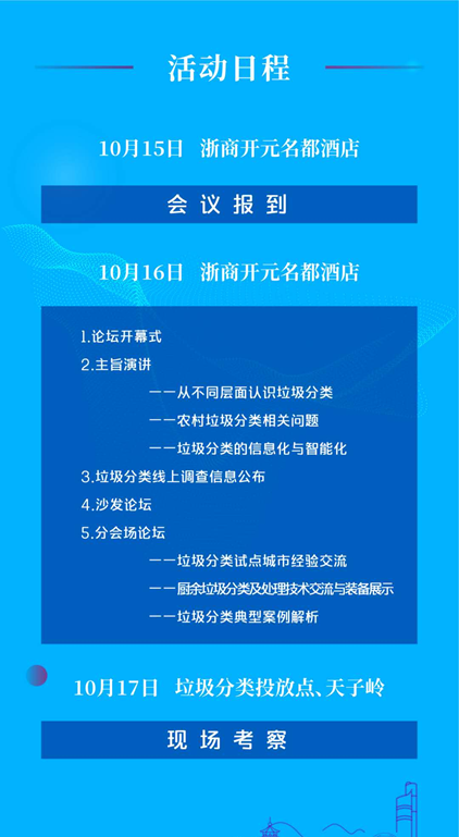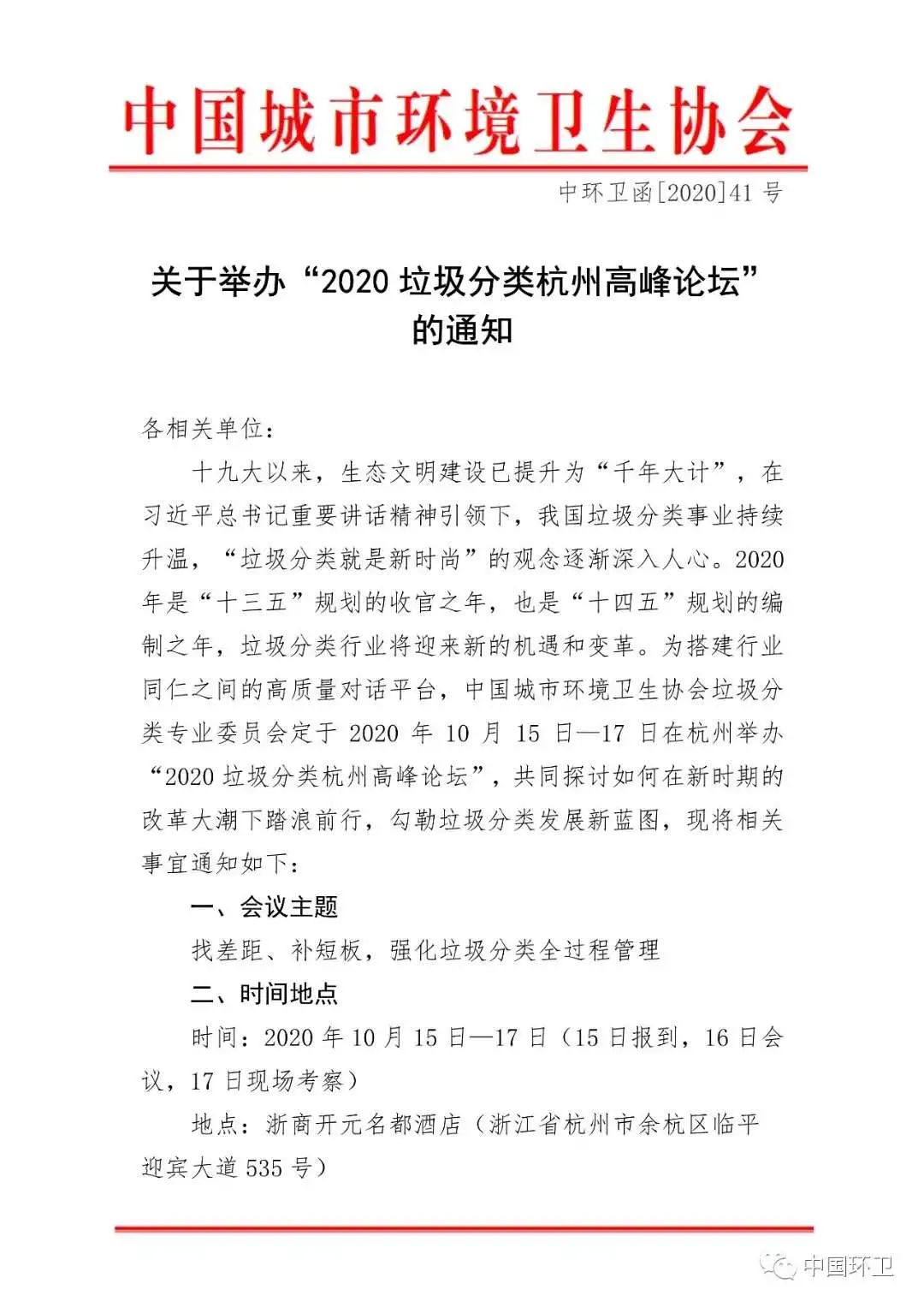 文章導(dǎo)讀中國城市環(huán)境衛(wèi)生協(xié)會垃圾分類專業(yè)委員會舉辦的“2020 垃圾分類杭州高峰論壇”,將于2020 年 10 月 15 日—17 日在杭州舉行。會議以“找差距、補(bǔ)短板,強(qiáng)化垃圾分類全過程管理”為主題,將薈萃全國環(huán)衛(wèi)領(lǐng)域精英,包括中國城市環(huán)境衛(wèi)生協(xié)會會長徐文龍、中國城市環(huán)境衛(wèi)生協(xié)會秘書長劉晶昊、中國...