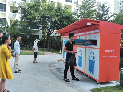居民正在使用智能垃圾分類柜投放垃圾。符吉茂 攝“既環(huán)保,又能換錢,還能提高我們的垃圾分類意識和分類正確率,一舉多得,這個智能垃圾分類柜值得點贊?!?月26日,家住崖州區(qū)保利·崖州灣小區(qū)居民候東將一個礦泉水瓶投進“大胃貓”智能垃圾分類柜后笑著說。日前,為助力三亞市生活垃圾分類工作,建設“無廢城市”,崖...