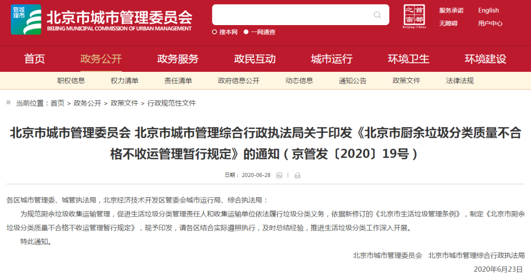 文章導讀為規(guī)范廚余垃圾收集運輸管理,促進生活垃圾分類管理責任人和收集運輸單位依法履行垃圾分類義務,依據(jù)《北京市生活垃圾管理條例》,制定《北京市廚余垃圾分類質量不合格不收運管理暫行規(guī)定》。為規(guī)范廚余垃圾收集運輸管理,促進生活垃圾分類管理責任人和收集運輸單位依法履行垃圾分類義務,北京市城市管理委員會 北...