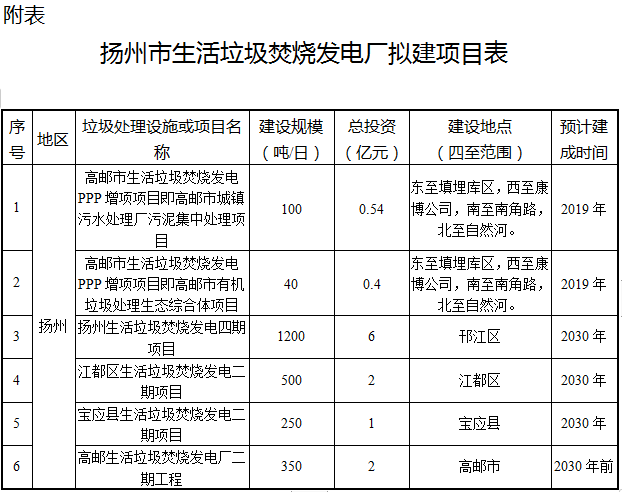 日前揚(yáng)州市人民政府公示了《揚(yáng)州市生活垃圾焚燒發(fā)電廠擬建項目表》,共6個項目,總投資11.94億元,具體內(nèi)容如下:為貫徹國家發(fā)展改革委等五部委關(guān)于《關(guān)于進(jìn)一步做好生活垃圾焚燒發(fā)電廠規(guī)劃選址工作的通知》(發(fā)改環(huán)資規(guī)〔2017〕2166號)精神,提升揚(yáng)州環(huán)境質(zhì)量,提高全市生活垃圾無害化處理能力和資源循環(huán)利...