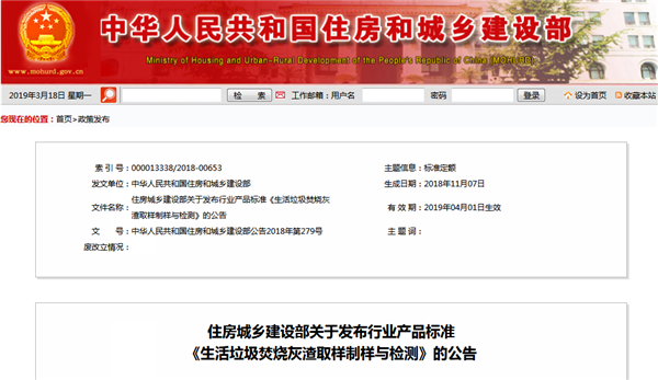 日前住房城鄉(xiāng)建設(shè)部發(fā)布了行業(yè)產(chǎn)品標(biāo)準(zhǔn)《生活垃圾焚燒灰渣取樣制樣與檢測(cè)》,編號(hào)為CJ/T531-2018,自2019年4月1日起實(shí)施。具體內(nèi)容如下:現(xiàn)批準(zhǔn)《生活垃圾焚燒灰渣取樣制樣與檢測(cè)》為城鎮(zhèn)建設(shè)行業(yè)產(chǎn)品標(biāo)準(zhǔn),編號(hào)為CJ/T531-2018,自2019年4月1日起實(shí)施。本標(biāo)準(zhǔn)在住房城鄉(xiāng)建設(shè)部門戶網(wǎng)站...