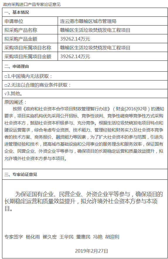 日前江蘇政府采購(gòu)網(wǎng)發(fā)布了《贛榆區(qū)生活垃圾焚燒發(fā)電工程PPP項(xiàng)目境外社會(huì)資本采購(gòu)專家論證》,論證意見(jiàn)為,按照《政府和社會(huì)資本合作項(xiàng)目財(cái)政管理暫行辦法》(財(cái)金[2016]92號(hào))的通知要求,項(xiàng)目實(shí)施機(jī)構(gòu)優(yōu)先采用公開招標(biāo)、競(jìng)爭(zhēng)性談判、競(jìng)爭(zhēng)性磋商等競(jìng)爭(zhēng)性方式采購(gòu)社會(huì)資本方,鼓勵(lì)社會(huì)資本積極參與、充分競(jìng)爭(zhēng)。根...