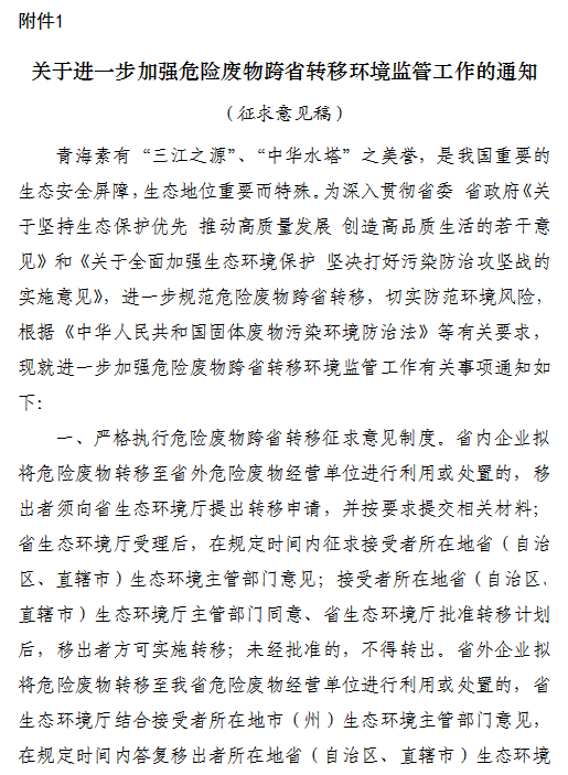 關(guān)于征求《關(guān)于進(jìn)一步加強(qiáng)危險(xiǎn)廢物跨省轉(zhuǎn)移環(huán)境監(jiān)管工作的通知(征求意見(jiàn)稿)》意見(jiàn)建議的函各市(州)生態(tài)環(huán)境局,省固體廢物污染防治中心、省環(huán)境保護(hù)綜合行政執(zhí)法監(jiān)督局,相關(guān)危險(xiǎn)廢物產(chǎn)生、經(jīng)營(yíng)單位:為強(qiáng)化危險(xiǎn)廢物跨省轉(zhuǎn)移環(huán)境監(jiān)管,切實(shí)防范環(huán)境風(fēng)險(xiǎn),青海省生態(tài)環(huán)境廳草擬了《關(guān)于進(jìn)一步加強(qiáng)危險(xiǎn)廢物跨省轉(zhuǎn)移環(huán)境監(jiān)...