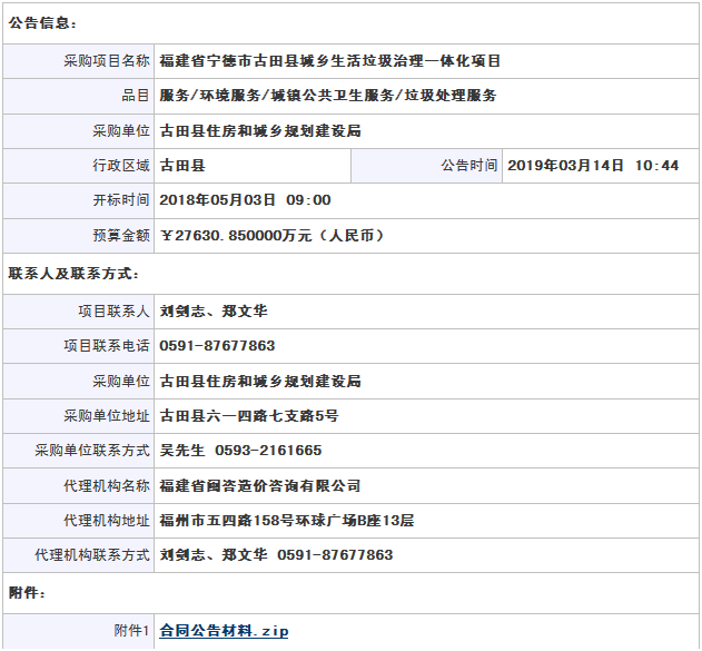 福建省閩咨造價(jià)咨詢有限公司受古田縣住房和城鄉(xiāng)規(guī)劃建設(shè)局委托,根據(jù)《中華人民共和國(guó)政府采購(gòu)法》等有關(guān)規(guī)定,現(xiàn)對(duì)福建省寧德市古田縣城鄉(xiāng)生活垃圾治理一體化項(xiàng)目進(jìn)行其他招標(biāo),歡迎合格的供應(yīng)商前來(lái)投標(biāo)。項(xiàng)目名稱:福建省寧德市古田縣城鄉(xiāng)生活垃圾治理一體化項(xiàng)目項(xiàng)目編號(hào):閩咨招[2018]12號(hào)項(xiàng)目聯(lián)系方式:項(xiàng)目聯(lián)...
