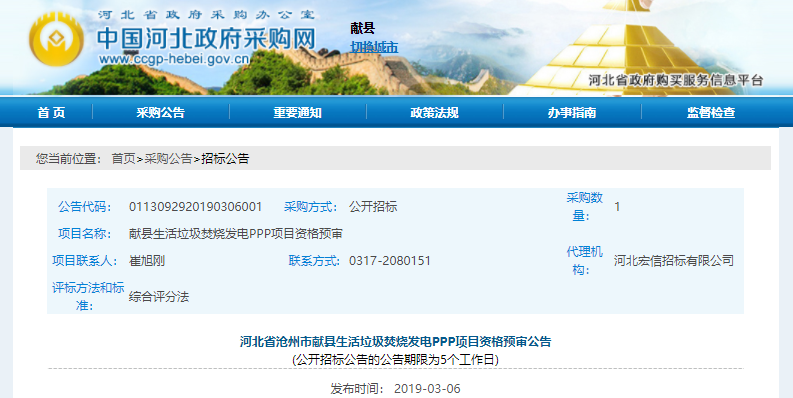 中國環(huán)聯(lián)網獲悉,3月6日,河北省滄州市獻縣生活垃圾焚燒發(fā)電PPP項目發(fā)布資格預審公告。本項目中主要建設內容為:2×300t/d機械爐排爐+1×12MW凝汽式汽輪發(fā)電機組;配套建設垃圾接受與儲存系統(tǒng)、垃圾焚燒系統(tǒng)、余熱發(fā)電系統(tǒng)、煙氣凈化處理系統(tǒng)、灰渣處理系統(tǒng)、水處理系統(tǒng)等。本項目采用PPP運作方式中的...