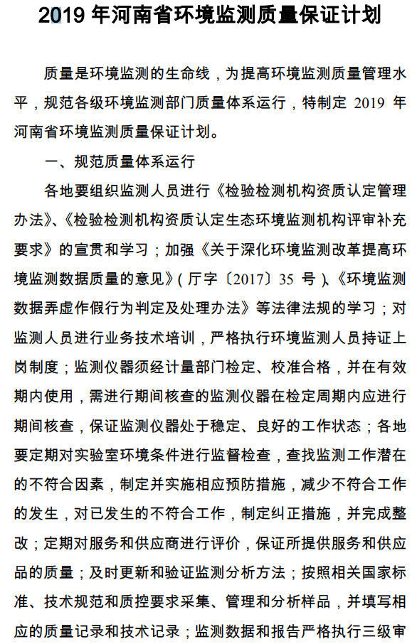 近日,河南省生態(tài)環(huán)境廳發(fā)布了2019年河南省環(huán)境監(jiān)測質(zhì)量保證計劃,全文如下:河南省環(huán)境保護廳辦公室關(guān)于印發(fā)2019年河南省環(huán)境監(jiān)測質(zhì)量保證計劃的通知各省轄市環(huán)保局、鄭州航空港經(jīng)濟綜合實驗區(qū)規(guī)劃市政建設(shè)環(huán)保局:為貫徹落實中共中央辦公廳、國務(wù)院辦公廳《關(guān)于深化環(huán)境監(jiān)測改革提高環(huán)境監(jiān)測數(shù)據(jù)質(zhì)量的意見》(廳...