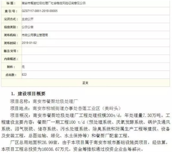 2019年1月2日,南安市政公用事業(yè)管理局發(fā)布兩份《社會穩(wěn)定風險征詢意見公示》,主要內(nèi)容關(guān)于南安市生活垃圾焚燒發(fā)電廠提級改造,以及南安市餐廚垃圾處理廠建設(shè)兩項工程。具體如下:南安市生活垃圾焚燒發(fā)電廠提級改造工程項目位于柳城街道杏蓮工業(yè)區(qū)(美嶺頭),提級改造后日處理垃圾量將達到每日1500噸,年處理量...