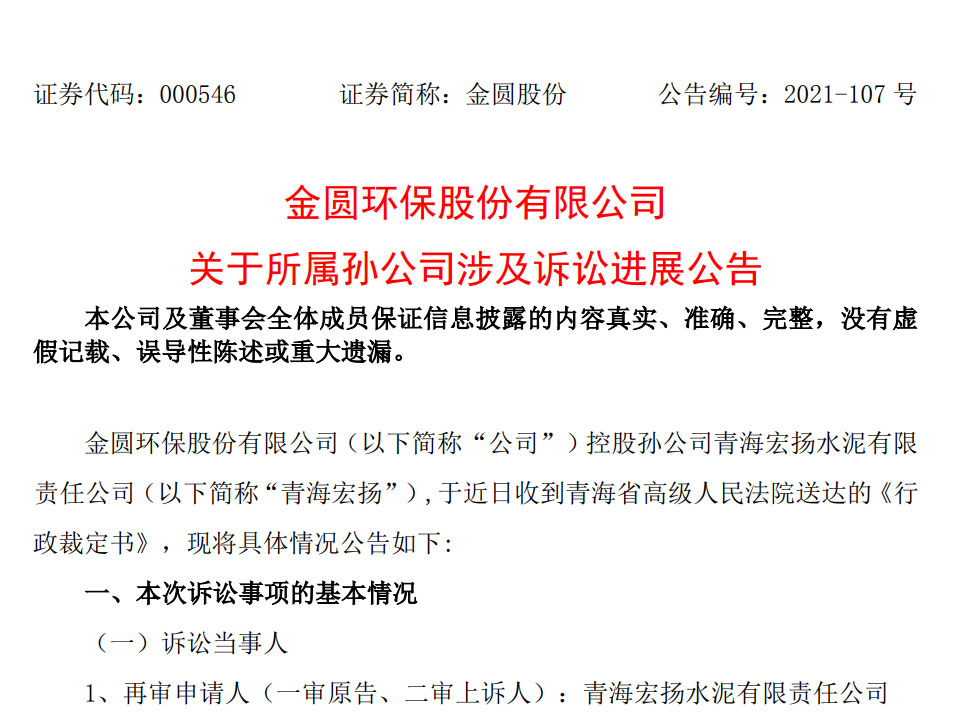 因為5萬元的環(huán)保處罰,導(dǎo)致3655萬元稅收優(yōu)惠沒有了,是不是有點因小失大?2021年12月29日,金圓環(huán)保股份有限公司(下稱“金圓股份”)發(fā)布公告,宣布了一起所屬孫公司青海宏揚水泥有限責(zé)任公司(下稱“青海宏揚”)涉及訴訟的進展,青海宏揚要求確認環(huán)保處罰無效的再審申請被法院駁回。這意味著,經(jīng)歷了一審、...