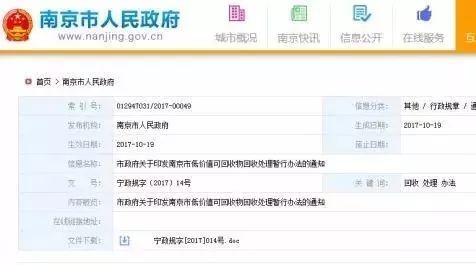 文章導(dǎo)讀 10月19日,南京市政府公布了《南京市低價(jià)值可回收物回收處理暫行辦法》,根據(jù)辦法規(guī)定,城市管理部門負(fù)責(zé)管理轄區(qū)內(nèi)低價(jià)值可回收物回收工作,并通過政府采購方式向企業(yè)購買低價(jià)值可回收物的回收、處理服務(wù)。辦法自今年11月20日起施行,有效期3年。 《辦法》公布后,南京成為繼廣州之后,又一個(gè)出臺(tái)有關(guān)...