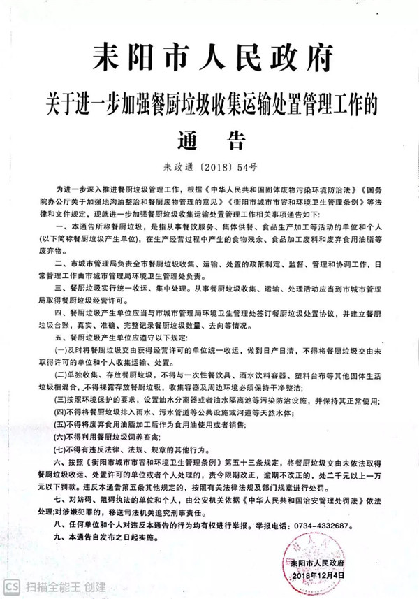 為進一步深入推進餐廚垃圾管理工作,根據(jù)《中華人民共和國固體廢物污染環(huán)境防治法》《國務院辦公廳關(guān)于加強地溝油整治和餐廚廢物管理的意見》《衡陽市城市市容和環(huán)境衛(wèi)生管理條例》等法律和文件規(guī)定,現(xiàn)就進一步加強餐廚垃圾收集運輸處置管理工作相關(guān)事項通告如下:耒陽市人民政府關(guān)于進一步加強餐廚垃圾收集運輸處置管理工...