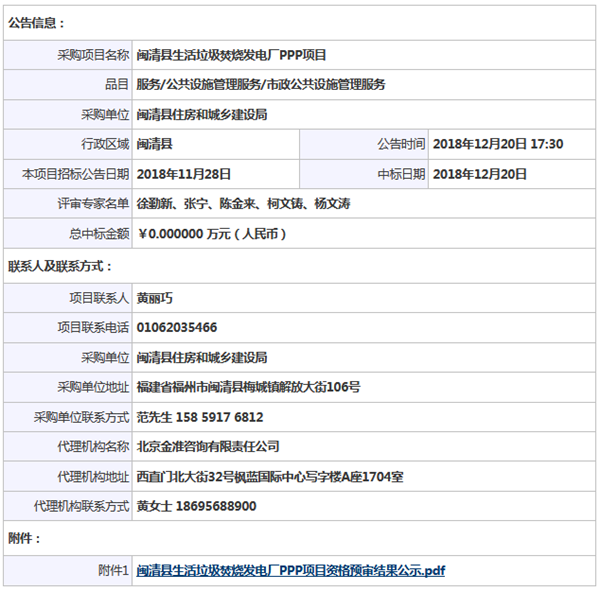 北京金準咨詢有限責任公司受閩清縣住房和城鄉(xiāng)建設局的委托,就“閩清縣生活垃圾焚燒發(fā)電廠PPP項目”項目(項目編號:JZXM-2018002)組織采購,評標工作已經(jīng)結(jié)束,中標結(jié)果如下:延伸閱讀:福建閩清縣生活垃圾焚燒發(fā)電廠PPP項目資格預審公告(第三次)閩清縣生活垃圾焚燒發(fā)電廠PPP項目資格預審(第二次...