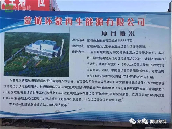 最新消息!安徽蒙城縣生活垃圾焚燒發(fā)電項目將于明年7月開始垃圾焚燒調(diào)試,明年年底正式投入使用。蒙城縣生活垃圾焚燒發(fā)電PPP項目于2017年9月12日簽署PP協(xié)議。項目總投資為33049萬元。項目占地約70畝(一期工程),項目建設于2018年4月28日開工。項目主要建設內(nèi)容為一座日處理1050噸的生活垃...