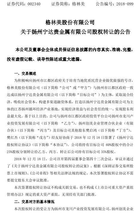 12月18日,格林美發(fā)布公告,公司將持有揚州寧達貴金屬有限公司60%股權(quán)中的合計25%股權(quán)分別轉(zhuǎn)讓給揚州市江都區(qū)政府投資平臺公司揚州市龍川產(chǎn)業(yè)投資發(fā)展有限公司、揚州創(chuàng)美企業(yè)管理合伙企業(yè)(有限合伙)。轉(zhuǎn)讓后公司持有目標公司35%股權(quán)。揚州寧達貴金屬有限公司主要從事鍺金屬回收、工業(yè)固體廢棄物填埋、電子廢...