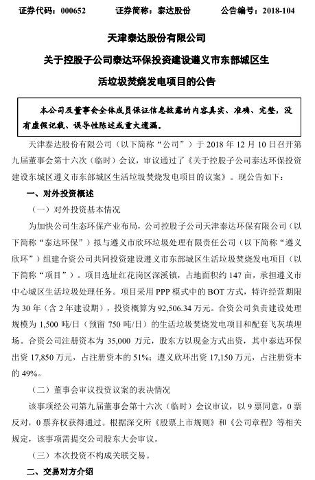日前,泰達環(huán)保發(fā)布公告,公司控股子公司天津泰達環(huán)保有限公司(以下簡稱“泰達環(huán)?!保M與遵義市欣環(huán)垃圾處理有限責任公司(以下簡稱“遵義欣環(huán)”)組建合資公司共同投資建設(shè)遵義市東部城區(qū)生活垃圾焚燒發(fā)電項目(以下簡稱“項目”)。項目選址紅花崗區(qū)深溪鎮(zhèn),占地面積約 147 畝,承擔遵義市中心城區(qū)生活垃圾處理任...