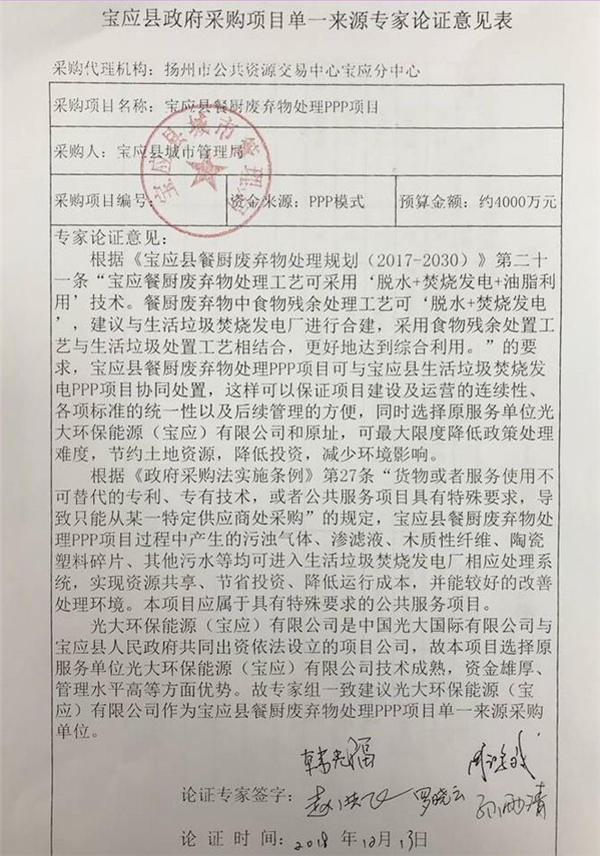 揚(yáng)州市公共資源交易中心寶應(yīng)分中心受寶應(yīng)縣城市管理局的委托,就其所需的寶應(yīng)縣餐廚廢棄物處理PPP項(xiàng)目進(jìn)行政府采購(gòu)。根據(jù)本項(xiàng)目的特殊情況及采購(gòu)人的申請(qǐng),經(jīng)專(zhuān)家論證對(duì)其擬采用的單一來(lái)源采購(gòu)方式,相關(guān)內(nèi)容公示如下:1、論證人員名單姓名 工作單位韓光福 住建部可持續(xù)發(fā)展與資源環(huán)境專(zhuān)家委員會(huì)孫雨清 蘇州市環(huán)衛(wèi)處...