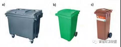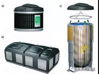 為了進行廢物的投放,產(chǎn)業(yè)所有者或物業(yè)管理公司應當為住宅提供生活垃圾的投放點。投放時采用的容器分為普通容器(更為常用)和埋入式容器(正在普及)兩種。常用的普通投放容器分別為140升(圖8中c)、240升(圖8中b)、600升(圖8中a)這三種。普通投放容器的缺點是,雖然容積不大,但卻會占據(jù)將對較大的空間。埋入式容器部分設(shè)置于地下,內(nèi)部配備高強度織物容納袋,容納能力遠高于普通容器,能夠在節(jié)省空間的同時,起到降低收運頻次的作用。收運時,收運車輛會將織物袋從容器中取出,通過打開袋底的機關(guān)清空廢物。