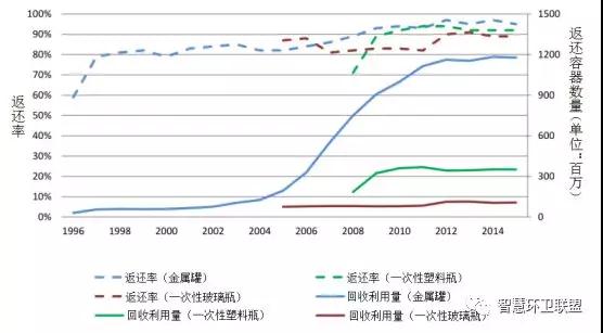 芬蘭的押金體系實現(xiàn)了極高的回收率。在PALPA體系剛剛成立的1996年,一次性金屬罐的回收率就已經(jīng)達到了59%,并馬上于第二年上升到了79%。到了2009年,金屬罐的回收率已經(jīng)超過90%。同樣地,PET瓶的押金體系在2008年開始實施時,返還率就已經(jīng)達到了71%,之后在兩年內(nèi)便上升到了90%以上。玻璃瓶在芬蘭擁有很長的押金制度實施積累,因此在PALPA在建立針對玻璃瓶的回收體系后,回收率就一直高于80%。從圖11還可以看出,一次性鐵罐的回收量自2004年起至2012年,一直都在迅速上升,并且保持穩(wěn)定的高回收率,反映出芬蘭飲料產(chǎn)業(yè)使用一次性金屬罐替代可重復使用玻璃瓶的趨勢。可重復使用玻璃瓶的回收率則更高,在2014年時為97%、2015年時為98%。