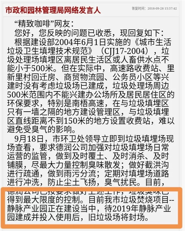 針對相關(guān)問題,市市政和園林管理局網(wǎng)絡(luò)發(fā)言人作出了回應(yīng),表示會(huì)進(jìn)一步督促垃圾填埋場的管理方加強(qiáng)對日常運(yùn)營的監(jiān)管工作?;貜?fù)中還提及重要一點(diǎn)——