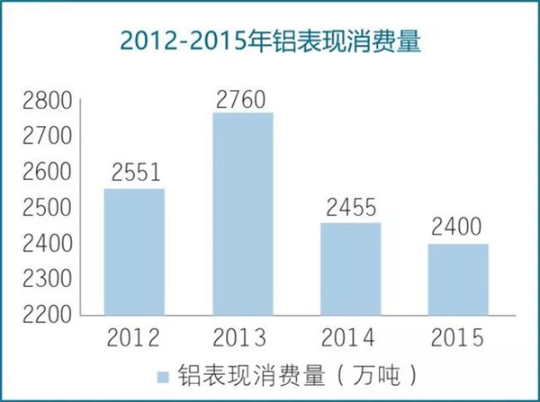 2015年全球原鋁需求為5,771萬噸,較2014年上升386.9萬噸。2015年全球原鋁產(chǎn)量增加410.3萬噸。中國區(qū)域鋁表觀消費(fèi)者由2012年的2551萬噸下降到2015年的2400萬噸。