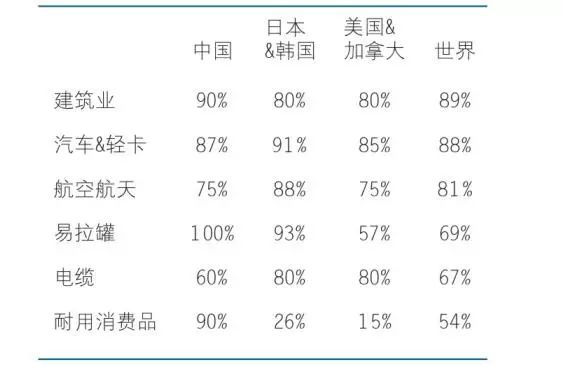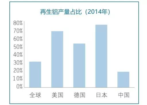 發(fā)達(dá)國家的再生鋁產(chǎn)量已經(jīng)普遍超過原鋁產(chǎn)量。根據(jù)USGS的統(tǒng)計(jì)數(shù)據(jù),2014年美國再生鋁產(chǎn)量為364萬噸,而原鋁產(chǎn)量僅為171萬噸,再生鋁產(chǎn)量占總產(chǎn)量的68%,日本2014 年的再生鋁產(chǎn)量占總產(chǎn)量的76%。