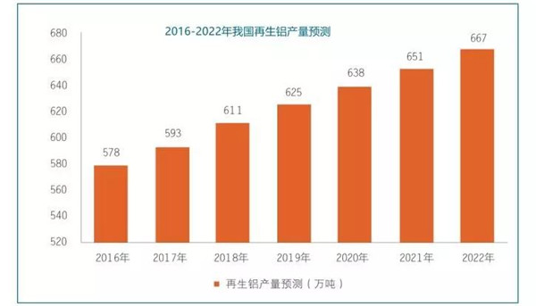 近年來,經(jīng)濟(jì)發(fā)展突飛猛進(jìn),隨之而來的便是節(jié)約資源、保護(hù)環(huán)境等要求,中國再生鋁企業(yè)受益迅速成長。2008年,再生鋁產(chǎn)量達(dá)到270萬噸,至2015達(dá)到575萬噸。由于受到國內(nèi)鋁市供需不平衡的影響,近幾年鋁價(jià)下降維持平穩(wěn),局部小反彈,大多數(shù)再生鋁企業(yè)利潤提升,再生鋁行業(yè)未來前景開始回升。按照2006年到2015再生鋁的增長趨勢,預(yù)計(jì)2016再生鋁產(chǎn)量達(dá)到578萬噸,2022年再生鋁產(chǎn)量達(dá)到667萬噸。