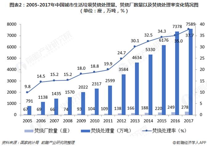 和傳統(tǒng)的堆肥、填埋等處理方式相比,焚燒具有處理效率高、占地面積小、對環(huán)境影響相對較小等優(yōu)點,更能滿足城市生活垃圾處理對減量化和無害化的要求。并且焚燒處理的方式還能利用焚燒產(chǎn)生的熱能,實現(xiàn)垃圾的資源化,這些優(yōu)勢使得垃圾焚燒處理在近些年逐漸得到了較為廣泛的應(yīng)用與推廣。焚燒垃圾場的數(shù)量從2005年的67座增長到2017年的278座,焚燒垃圾處理量由2005年的791萬噸增長到2017年的7589萬噸。焚燒處理率由2005年的9.8%上升到2017年的37.7%。