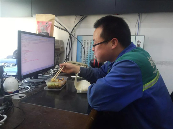 8時(shí)30分,在完成緊急搶修任務(wù)后,他邊啃面包,邊打開電腦處理OA文件,安排工作任務(wù)。