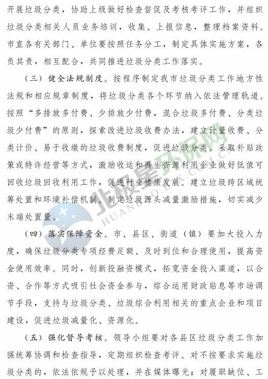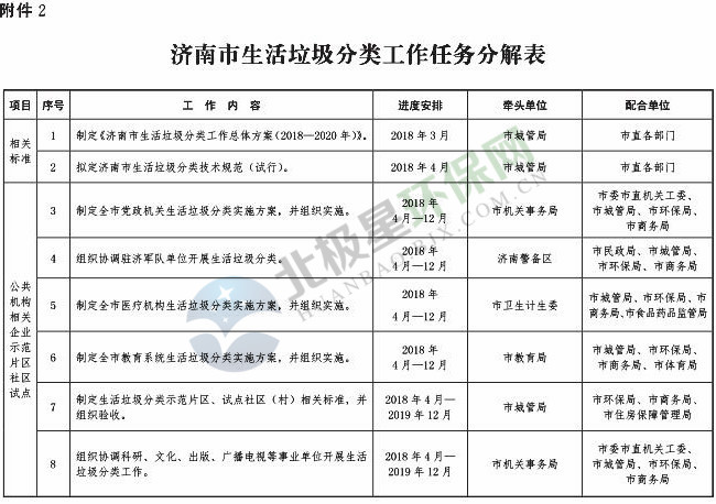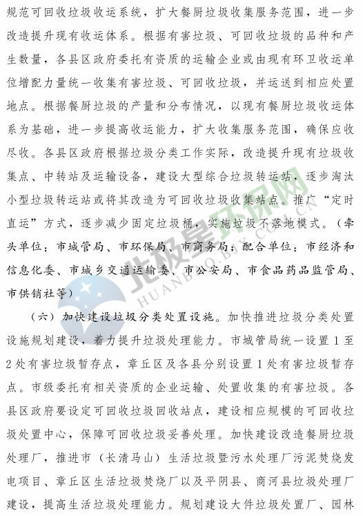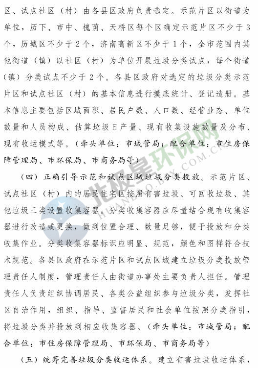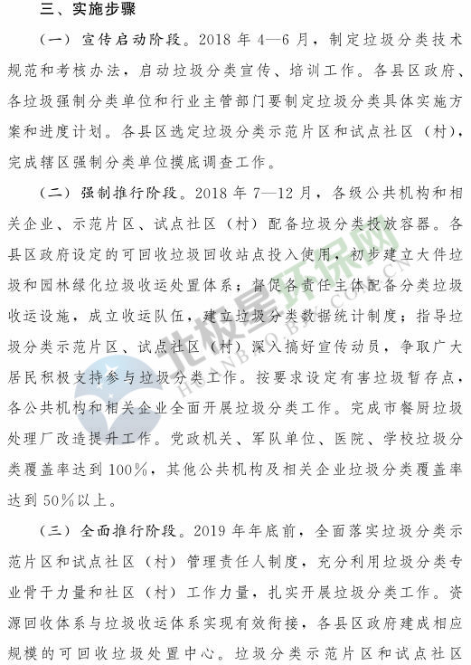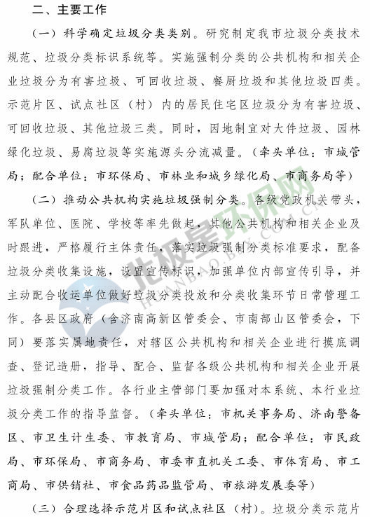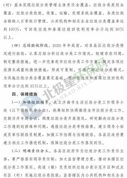 《濟南市生活垃圾分類工作總體方案(2018—2020年)》已經(jīng)印發(fā),《方案》提出,到 2020 年年底,全市形成較為完備的垃圾分類投放、收集、運輸、處理系統(tǒng);公共機構(gòu)及相關(guān)企業(yè)垃圾分類覆蓋率達到 100% ;在垃圾進入焚燒和填埋設施前,可回收垃圾和易腐垃圾回收利用率合計達到 35% 以上;建立垃圾分類相關(guān)法規(guī)制度和標準體系,通過垃圾分類示范片區(qū)、垃圾分類試點建設,形成可復制、可推廣的垃圾分類模式。詳情如下: