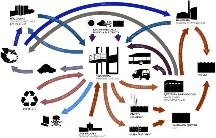 其中,1996年由斯德哥爾摩水公司、Fortum (能源公司) 和城市廢物回收公司合作開發(fā)的哈馬碧生態(tài)模型至關(guān)重要。該模型的主要原理是最大程度地實現(xiàn)材料和能源流的局部閉環(huán)。它展示了如何將廢物回收、水、地區(qū)供暖供冷和交通,與城市規(guī)劃、景觀及建筑設(shè)計進行整合, 最大限度地減少材料和能源的消耗。