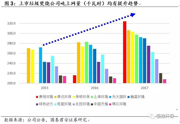 行業(yè)普遍出現(xiàn)噸發(fā)電量提升,而龍頭公司提升尤其明顯。行業(yè)產(chǎn)能第一的龍頭光大國際噸上網(wǎng)電量從2010年的227千瓦時(shí)提升到2017年的293千瓦時(shí),噸上網(wǎng)電量提升幅度達(dá)到66千瓦時(shí)。其他主要垃圾焚燒上市企業(yè)近兩三年來噸上網(wǎng)電量也均有較明顯提升,見圖3。