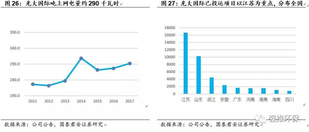 3)行業(yè)產(chǎn)能第一的龍頭光大國際噸上網(wǎng)電量從2010年的227千瓦時(shí)提升到2017年的293千瓦時(shí),噸上網(wǎng)電量提升幅千瓦時(shí)達(dá)66千瓦時(shí)。