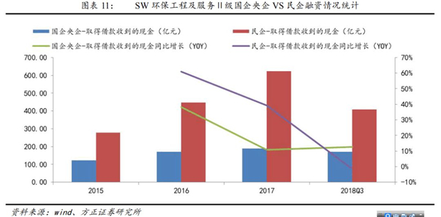 2018年民企融資陷入冰點(diǎn)。我們統(tǒng)計(jì)了SW環(huán)保工程及服務(wù)Ⅱ級(jí)公司的銀行借款情況,2018年前三季度國企和央企借款取得的現(xiàn)金規(guī)模171億元,同比增長(zhǎng)13%;民營企業(yè)借款取得的現(xiàn)金規(guī)模407億元,同比下降2%??梢?,2018年國有企業(yè)從銀行借款未受到影響,但民營企業(yè)從銀行借款取得的現(xiàn)金規(guī)模明顯縮小。