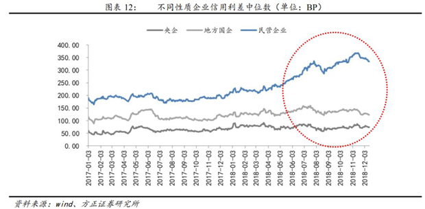 2018年民企融資信用利差持續(xù)擴(kuò)大。根據(jù)不同企業(yè)性質(zhì)的產(chǎn)業(yè)債信用利差統(tǒng)計(jì),2018年4月以來,民企信用利差持續(xù)擴(kuò)大,到11月中旬達(dá)到接近370BP,近期開始回落,目前利差水平約在350個(gè)BP。