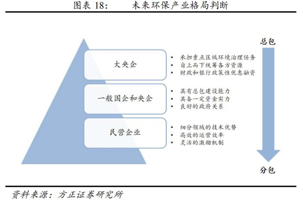我們認(rèn)為環(huán)保產(chǎn)業(yè)將放棄之前的粗放式發(fā)展,進(jìn)入追求高質(zhì)量發(fā)展的階段。經(jīng)過2-3年的格局重塑,我們認(rèn)為未來行業(yè)格局將形成國企央企主導(dǎo)投資、民企專注細(xì)分市場(chǎng)技術(shù)的新格局。