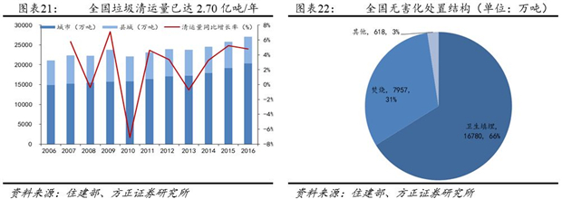 根據(jù)2016年住建部統(tǒng)計(jì)年鑒,目前我國生活垃圾年清運(yùn)量2.70億噸,無害化處置率約94%。無害化處置中,填埋、焚燒、其他的比例分別為66%、31%和3%,填埋仍是無害化處置的主流方式。